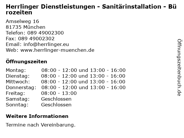 Branchen & Suchbegriffe zu Herrlinger Dienstleistungen - Sanitärinstallation - Bürozeiten:24, bis, bürozeiten, dienstleistungen, heizungsbauunternehmen, heizungsinstallateure, herrlinger, lüftungsanlagenbauunternehmen, michael, montag, notdienst, sanitärinstallateure, sanitärinstallation, sonntag, std |