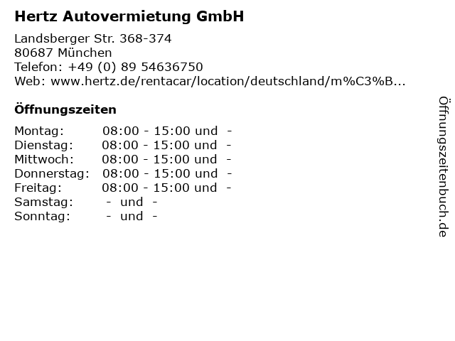 | Öffnungszeiten Hertz Autovermietung GmbH in München anzeigen | |