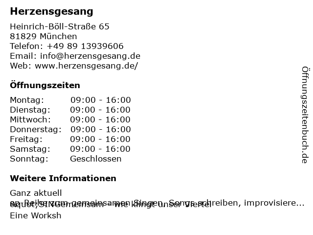 | Öffnungszeiten Herzensgesang in München anzeigen | |