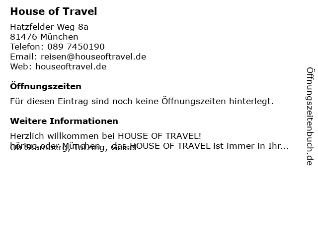 | Öffnungszeiten House of Travel in München anzeigen | |