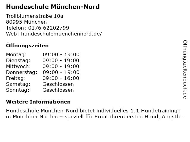 | Öffnungszeiten Hundeschule München-Nord in München anzeigen | |