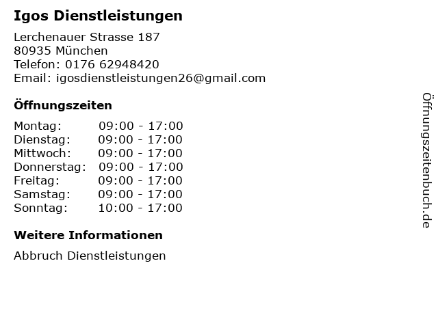 | Öffnungszeiten Igos Dienstleistungen in München anzeigen | |