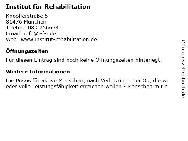 | Öffnungszeiten Institut für Rehabilitation in München anzeigen | |