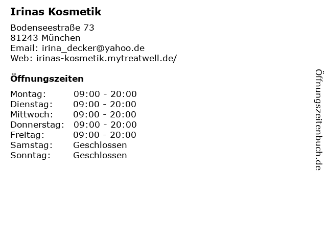 | Öffnungszeiten Irinas Kosmetik in München anzeigen | |