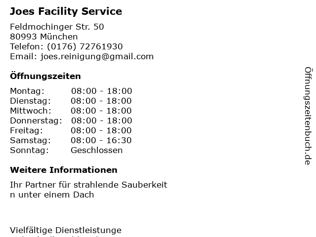 | Öffnungszeiten Joes Facility Service in München anzeigen | |