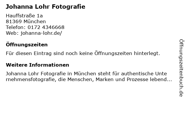 | Öffnungszeiten Johanna Lohr Fotografie in München anzeigen | |