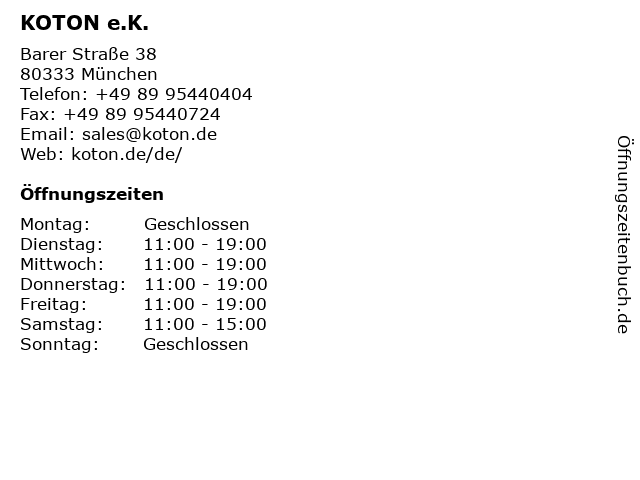 | Öffnungszeiten KOTON e.K. in München anzeigen | |