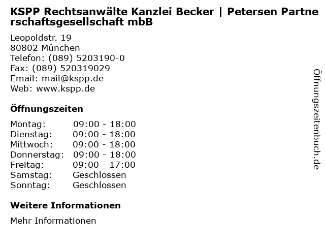 1 RFS ? Quensell Rechtsanwaltspartnerschaft für Schuldenbereinigung mbB (Entfernung: 0,08 km) Leopoldstraße 23, 80802 München 3 Peres & Partner Rechtsanwälte Partnerschaft mbB (Entfernung: 0,32 km) Friedrichstr. 17, 80801 München 4 m law group Besner Kremer Rechtsanwälte Partnerschaft mbB (Entfernung: 0,40 km) Leopoldstr. 16, 80802 München 6 |