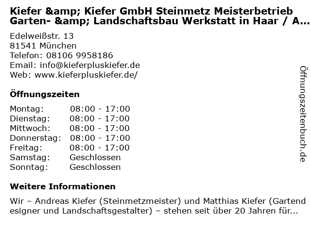 1 Kiefer + Kiefer Steinmetzbetrieb, Garten-Landschaftsbau GmbH (Entfernung: 0,00 km) Edelweißstraße 13, 81541 München 5 Meisterbetrieb | Richard Wörle GmbH | München (Entfernung: 0,64 km) Untere weidenstr. 25 a, 81543 München 6 Anton Gritl Meisterbetrieb für Spenglerei und Bedachungen (Entfernung: 0,73 km) St.-Martin-Straße 44, 81541 München |