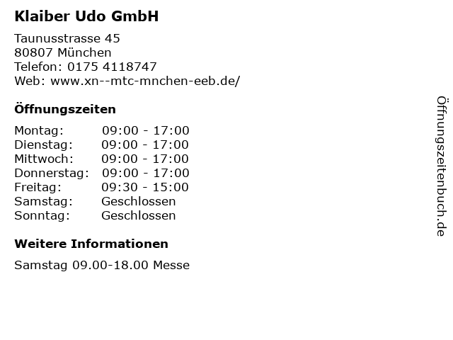 | Öffnungszeiten Klaiber Udo GmbH in München anzeigen | |