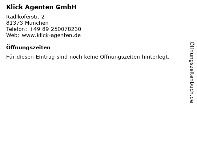 | Öffnungszeiten Klick Agenten GmbH in München anzeigen | |