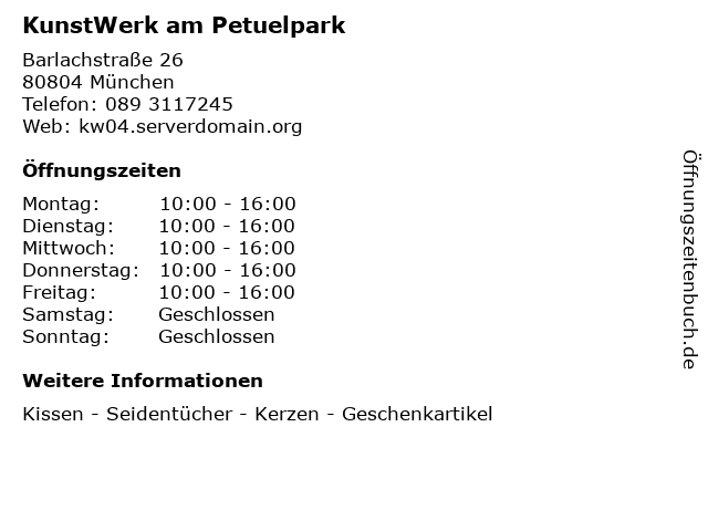 | Öffnungszeiten KunstWerk am Petuelpark in München anzeigen | |