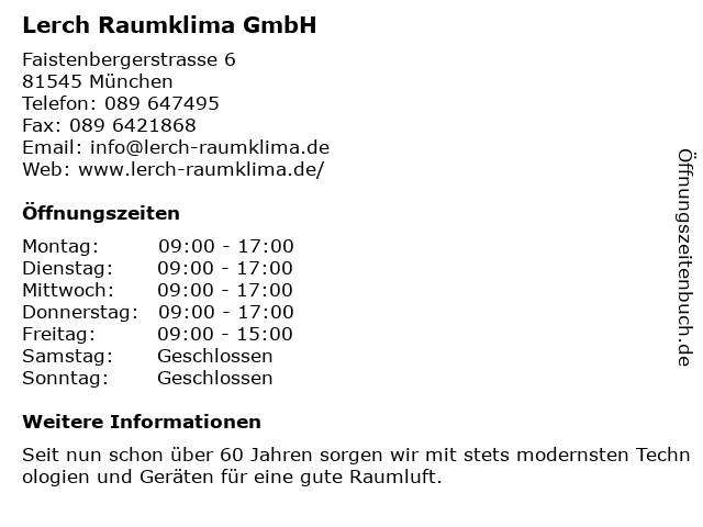| Öffnungszeiten Lerch Raumklima GmbH in München anzeigen | |