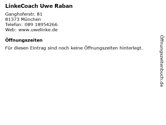 | Öffnungszeiten LinkeCoach Uwe Raban in München anzeigen | |