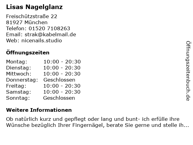 | Öffnungszeiten Lisas Nagelglanz in München anzeigen | |