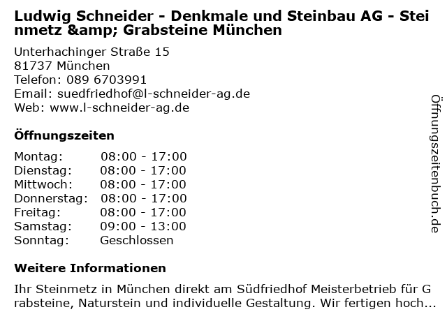 1 Schneider Ludwig Denkmale und Steinbau AG Steinmetzbetrieb (Entfernung: 3,11 km) St.-Martin-Str. 50, 81541 München 5 Kiefer + Kiefer Steinmetzbetrieb, Garten-Landschaftsbau GmbH (Entfernung: 3,83 km) Edelweißstraße 13, 81541 München 6 |