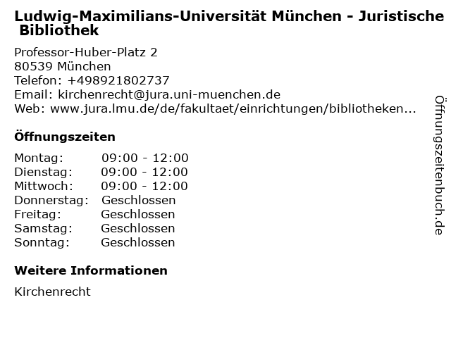 1 Ludwig-Maximilians-Universität München - Juristische Bibliothek (Entfernung: 0,00 km) Professor-Huber-Platz 2, 80539 München 2 Ludwig-Maximilians-Universität München - Juristische Bibliothek (Entfernung: 0,00 km) Professor-Huber-Platz 2, 80539 München 3 Ludwig-Maximilians-Universität München - Juristische Bibliothek (Entfernung: 0,13 km) Ludwigstr. 29, 80539 München 6 |