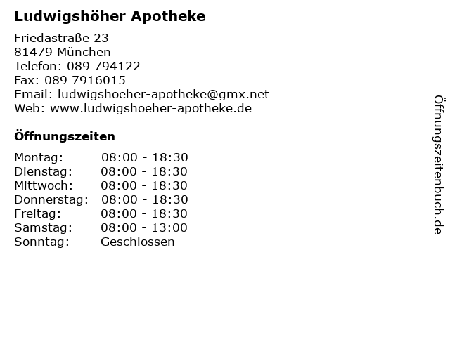 Öffnungszeiten Ludwigshöher Apotheke in München anzeigen | |