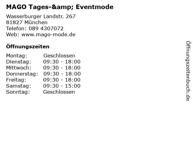 | Öffnungszeiten MAGO Tages-& Eventmode in München anzeigen | |