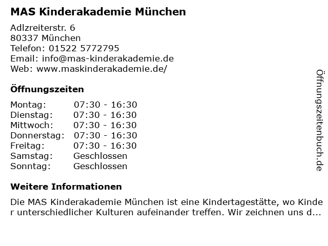 | Öffnungszeiten MAS Kinderakademie München in München anzeigen | |