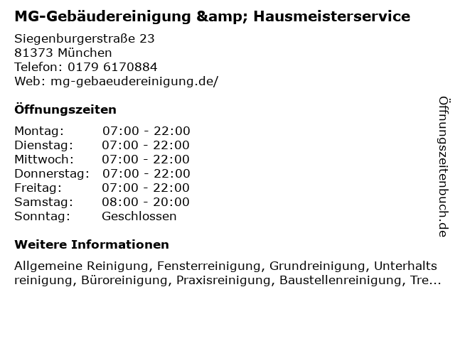 3 MG S. Marthen GmbH, Ihr 24 Std. Aufsperrdienst und Schlüsselnotdienst für das Westend zum Festpreis (Entfernung: 1,35 km) Westendstr. 65, 80339 München 4 Woitun GmbH Hausmeisterservice & Malerbetrieb (Entfernung: 1,98 km) Konrad-Celtis-Str. 36, 81369 München 6 Breiter Adalbert Inh. Ingeburg Breiter Gebäudereinigung (Entfernung: 2,63 km) Pestalozzistr. 50, 80469 München |
