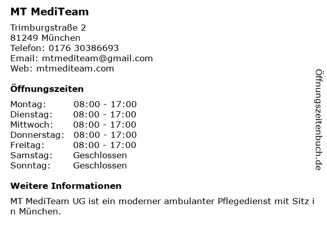 | Öffnungszeiten MT MediTeam in München anzeigen | |