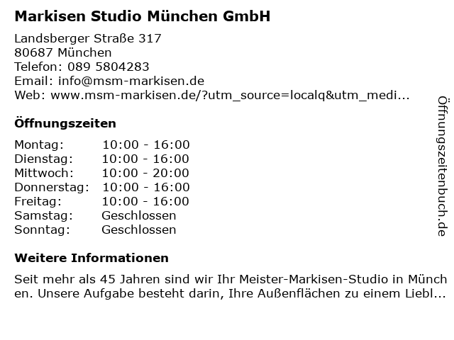 | Öffnungszeiten Markisen Studio München GmbH in München anzeigen | |