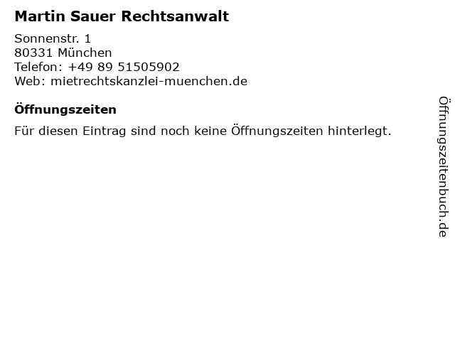 | Öffnungszeiten Martin Sauer Rechtsanwalt in München anzeigen | |