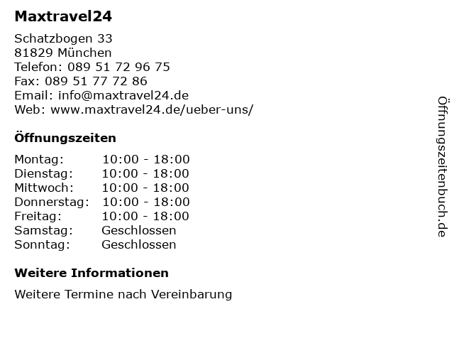 | Öffnungszeiten Maxtravel24 in München anzeigen | |