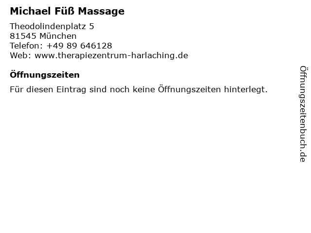 | Öffnungszeiten Michael Füß Massage in München anzeigen | |