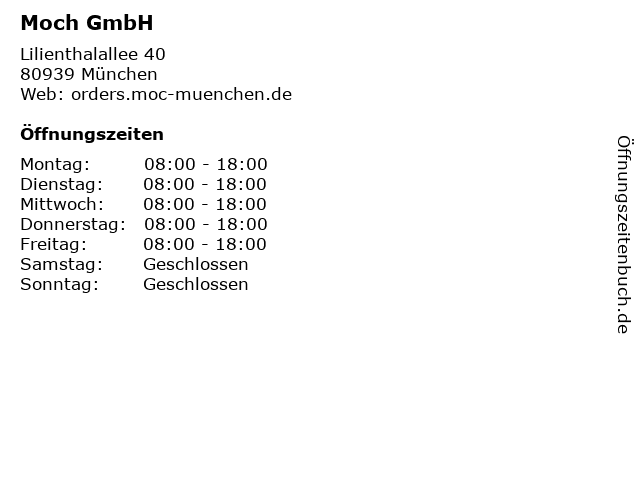 | Öffnungszeiten Moch GmbH in München anzeigen | |