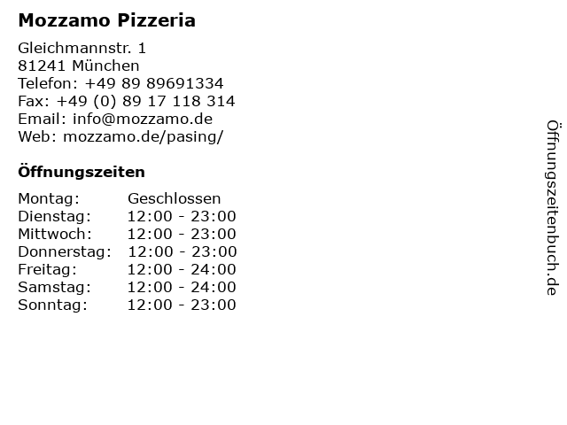 | Öffnungszeiten Mozzamo Pizzeria in München anzeigen | |