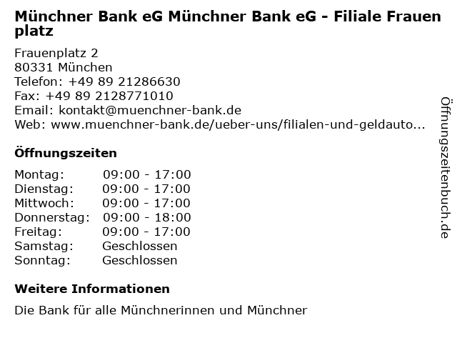 Branchen & Suchbegriffe zu Münchner Bank eG Münchner Bank eG - Filiale Frauenplatz:bank, beratung, eg, frauenplatz, geldautomat, genossenschaft, immobilienagentur, kredit, münchner, versicherung |