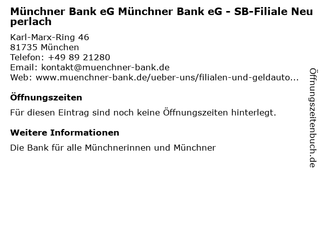 | Münchner Bank eG Münchner Bank eG - SB-Filiale Neuperlach anrufen | |