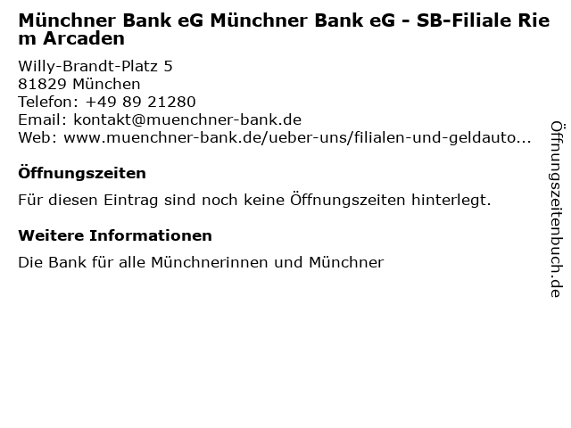 | Münchner Bank eG Münchner Bank eG - SB-Filiale Riem Arcaden anrufen | |