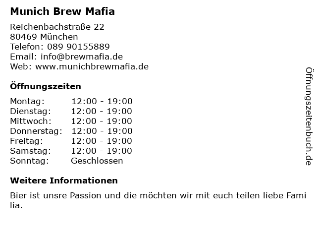 | Öffnungszeiten Munich Brew Mafia in München anzeigen | |