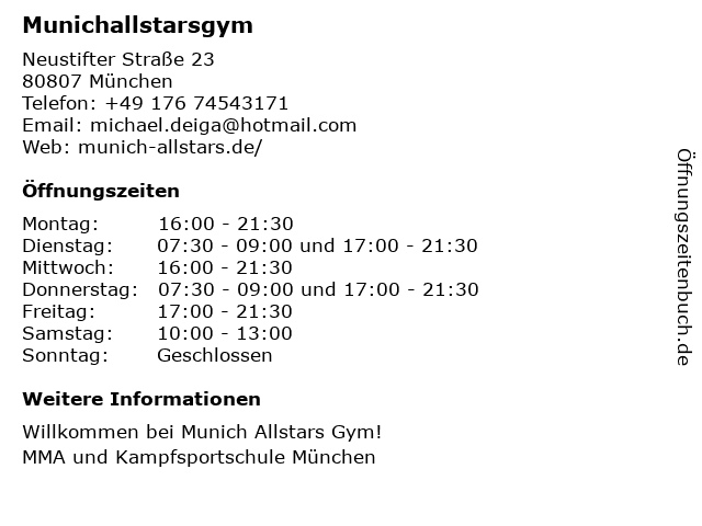| Öffnungszeiten Munichallstarsgym in München anzeigen | |