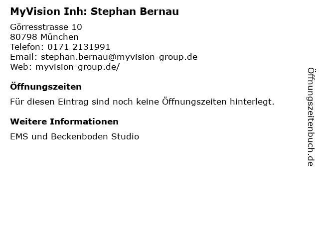 | Öffnungszeiten MyVision Inh: Stephan Bernau in München anzeigen | |