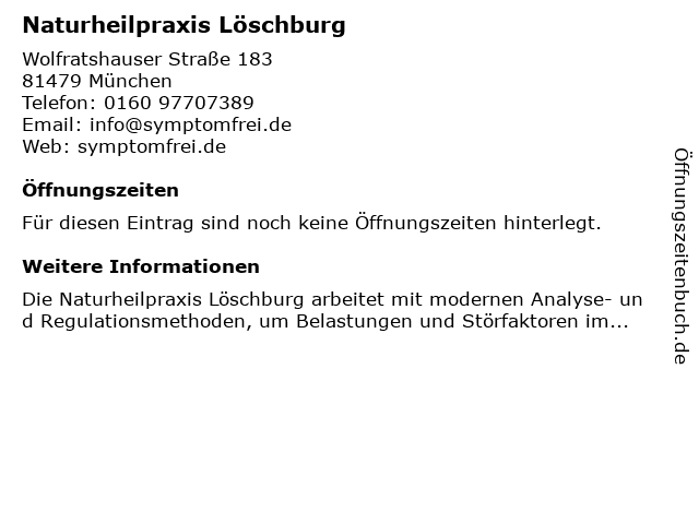 | Öffnungszeiten Naturheilpraxis Löschburg in München anzeigen | |