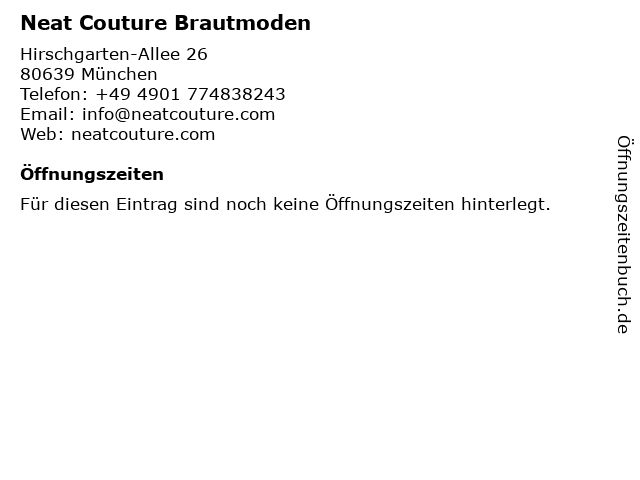 | Öffnungszeiten Neat Couture Brautmoden in München anzeigen | |