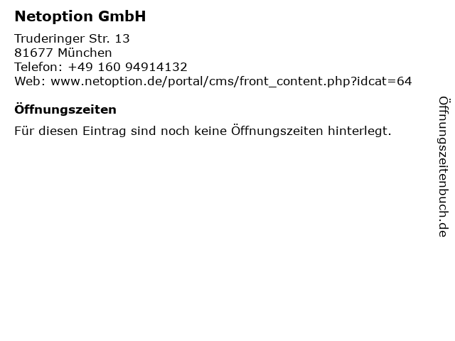 | Öffnungszeiten Netoption GmbH in München anzeigen | |