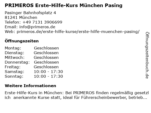 2 Vinzenzmurr Metzgerei - München - Pasing (Entfernung: 0,04 km) Pasinger Bahnhofsplatz 3, 81241 München 5 Telekom Shop München Pasing-Obermenzing (Entfernung: 0,05 km) Pasinger Bahnhofsplatz 2, 81241 München 6 Taxi München eG Genossenschaft der Münchner Taxiunternehmen Standplatz München-West Pasing-Neuaubing Pasing Bahnhof (Südseite) (Entfernung: 0,05 km) Pasinger Bahnhofsplatz 7, 81241 München |