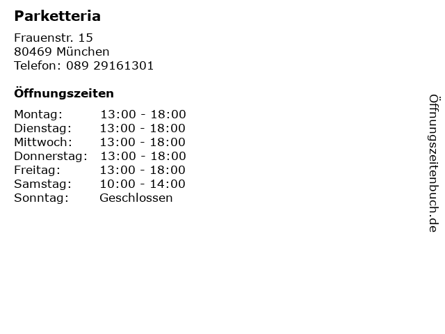 | Öffnungszeiten Parketteria in München anzeigen | |