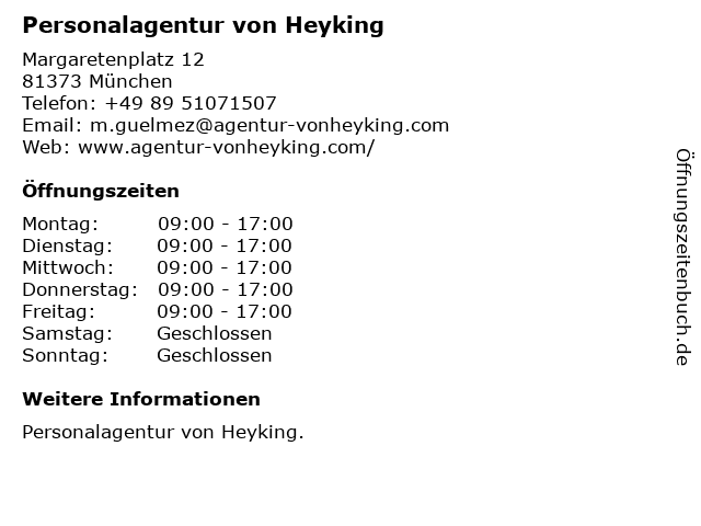 Öffnungszeiten Personalagentur von Heyking in München anzeigen | |