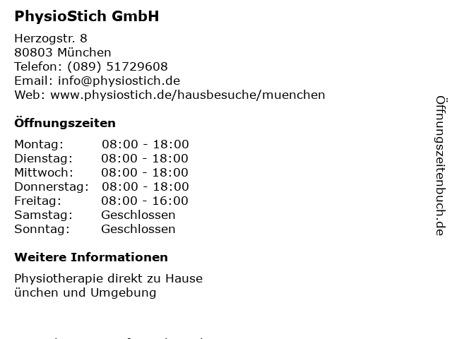 | Öffnungszeiten PhysioStich GmbH in München anzeigen | |