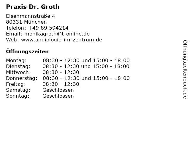 | Öffnungszeiten Praxis Dr. Groth in München anzeigen | |