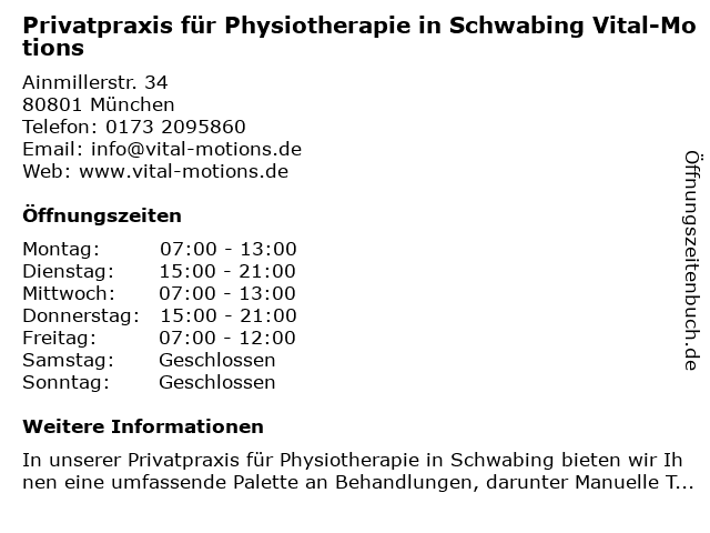Branchen & Suchbegriffe zu Privatpraxis für Physiotherapie in Schwabing Vital-Motions:motions, physiotherapie, privatpraxis, schwabing, vital |