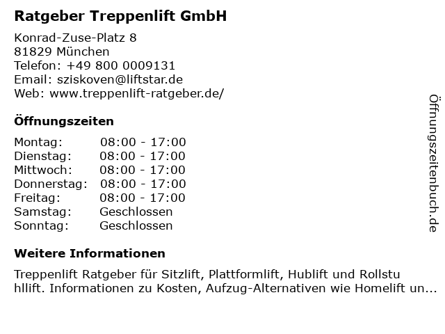 | Öffnungszeiten Ratgeber Treppenlift GmbH in München anzeigen | |