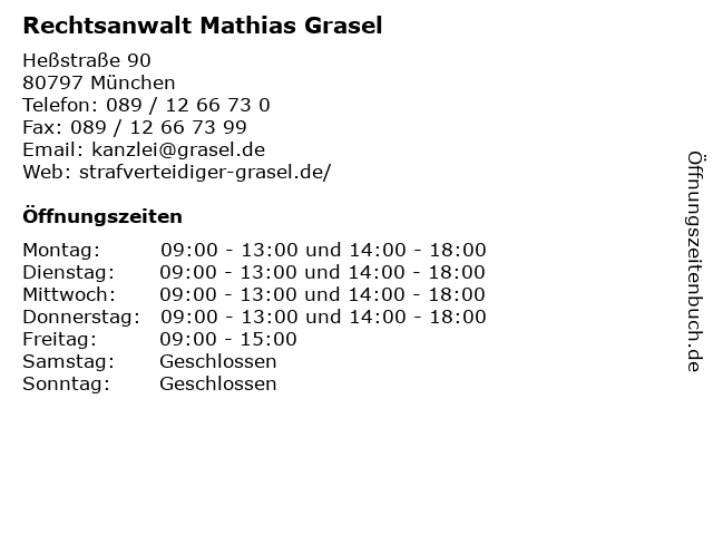 | Öffnungszeiten Rechtsanwalt Mathias Grasel in München anzeigen | |