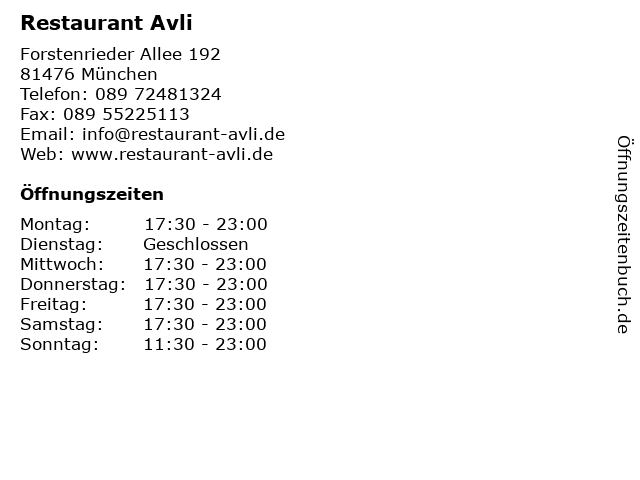 | Öffnungszeiten Restaurant Avli in München anzeigen | |